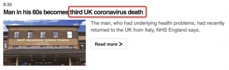 据BBC报道,英国出现第三例Covid-19死亡病例!