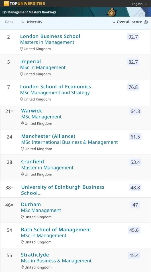 那么管理学Top10院校都需要多少分呢?小编根据QS 2020管理学硕士排名,汇总了这些院校的分数要求。